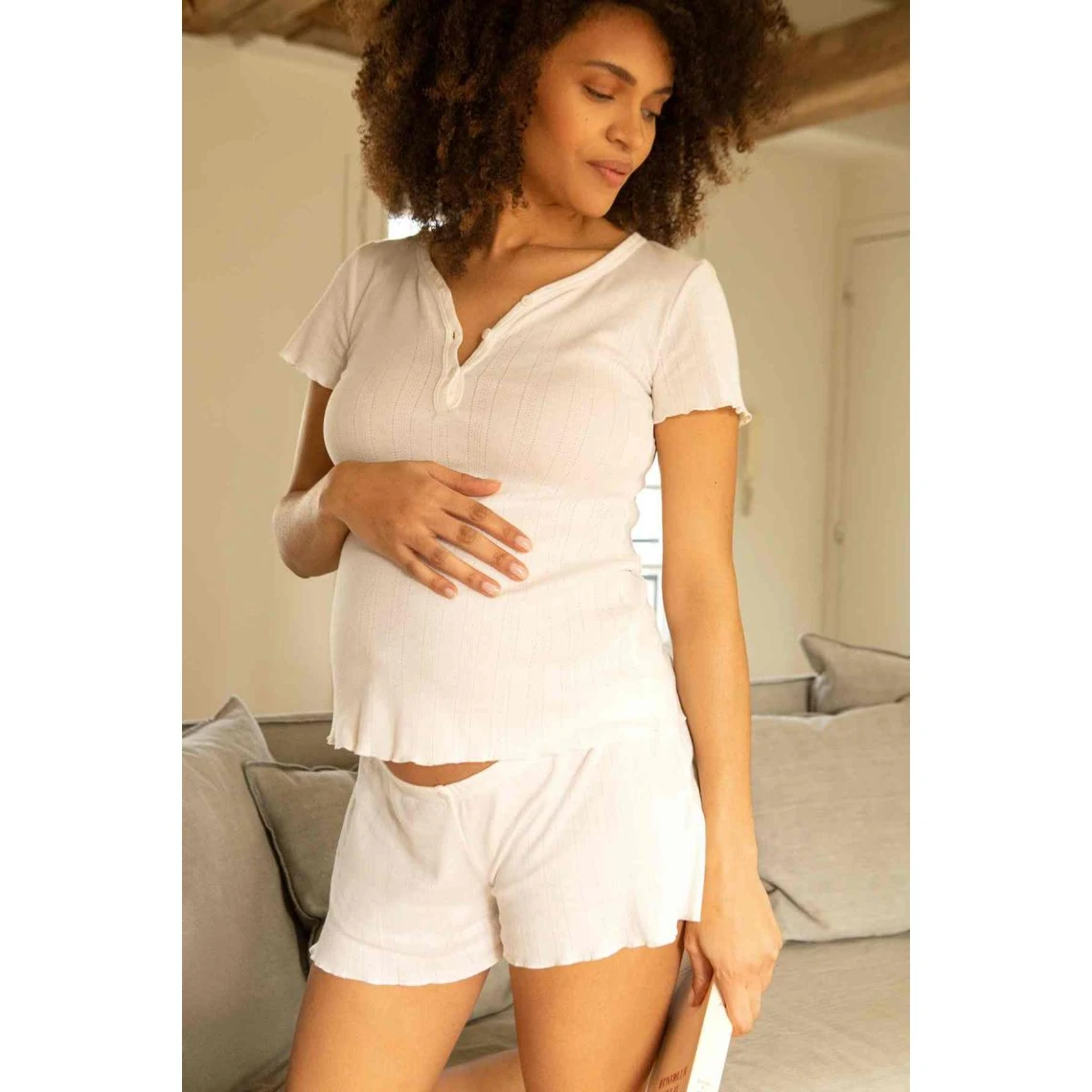 - Coloris : Blanc pur, facile à coordonner avec vos bas de pyjama ou shorts de maternité.