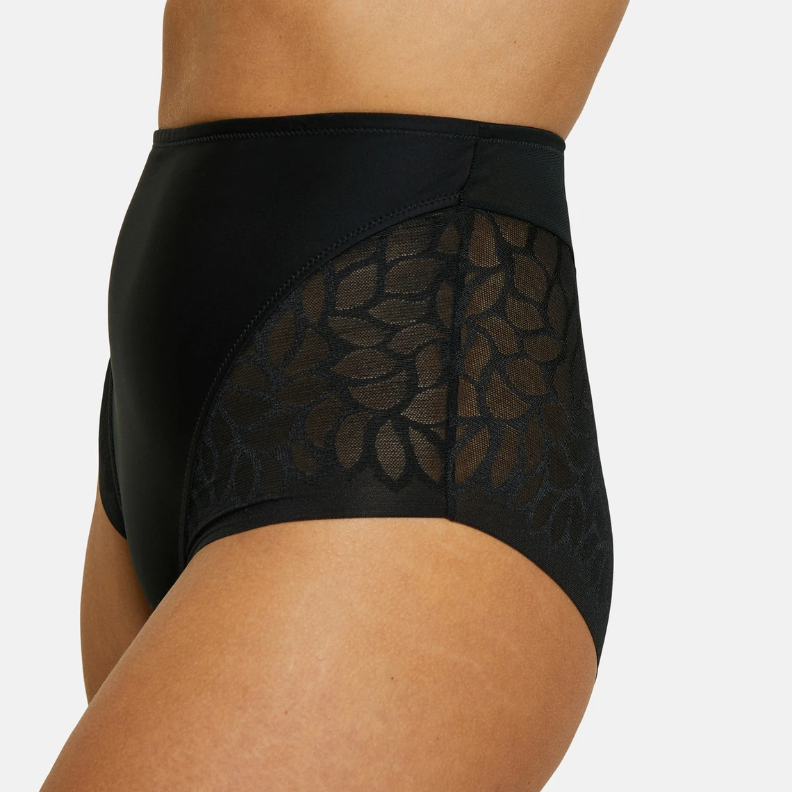 Conciliez confort et raffinement avec cette Culotte – Noire Sans Complexe taille haute, alliant une microfibre opaque à une belle dentelle ajourée.