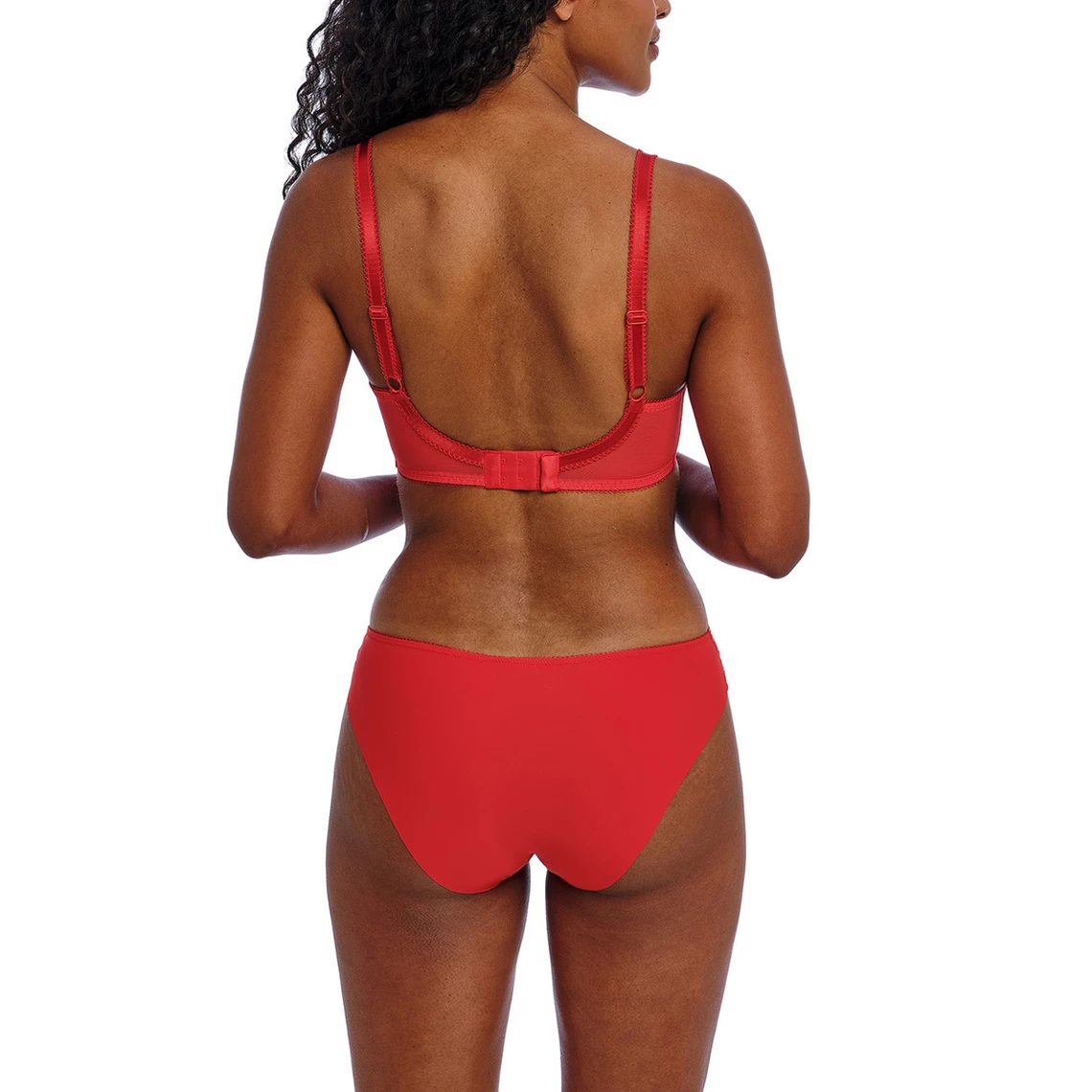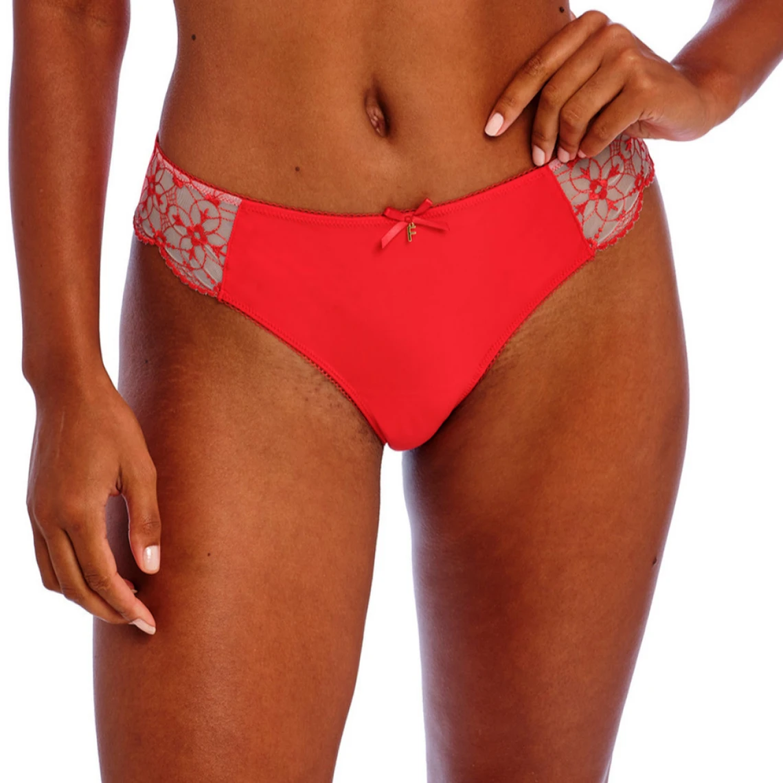 Soyez éco-chic avec le Slip Hallie de Freya dans notre superbe coloris Chilli Red ! Confectionné dans un tissu recyclé à bords francs et au toucher doux, ce slip offre une sensation de seconde peau qui vous fera oublier que vous le portez ! La magnifique broderie géométrique sur les côtés avant, ajoute une touche d’élégance et de fantaisie. Cette culotte rouge est l’alliance parfaite de style et de confort.