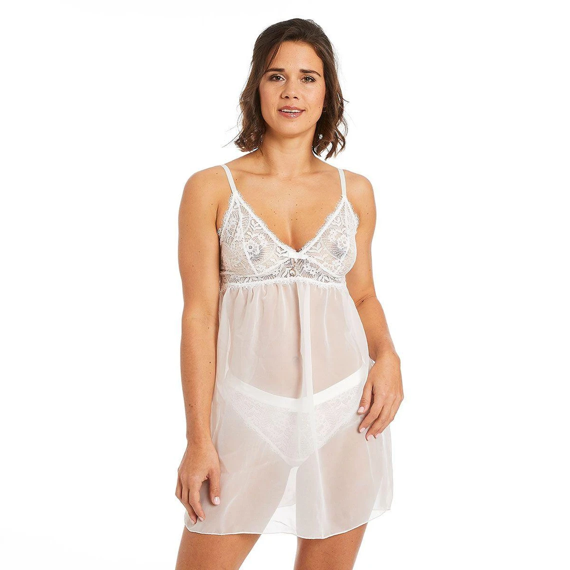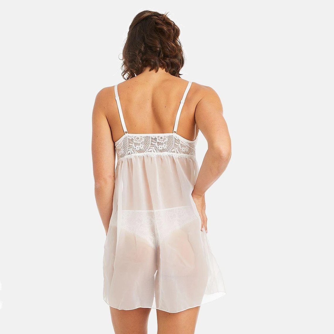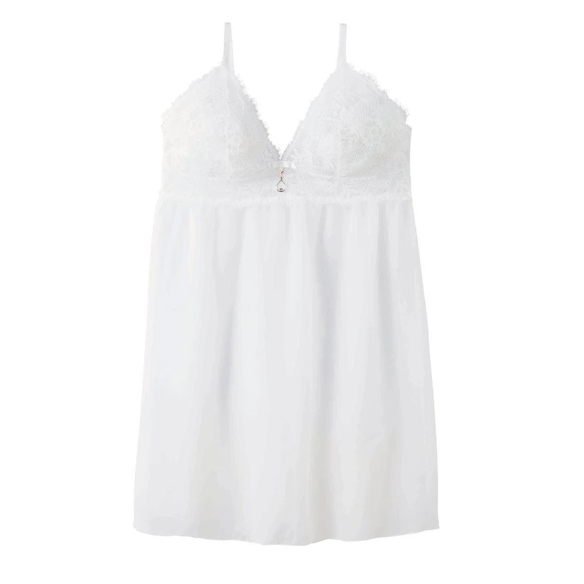 Nuisette en organza, galon de dentelle floral et satin. Petit noeud en satin et bijou fantaisie à l’entre bonnets. Disponible du 38/40 au 46/48.