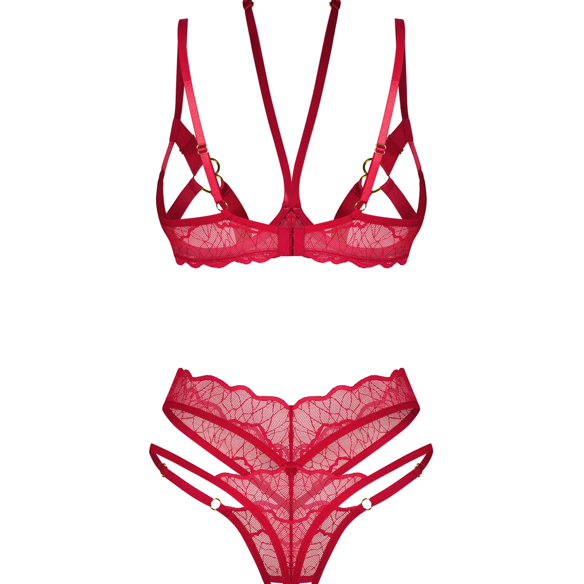 Parfait pour un look audacieux, cet ensemble de lingerie rouge est doté d’un soutien-gorge ouvert et d’un string ouvert assorti. Bretelles élastiques, dentelle délicate et accents dorés étincelants ajoutent une touche élégante. Avec ses bretelles larges et réglables et sa fermeture multi-crochet sécurisée, cet ensemble offre à la fois confort et charme.
