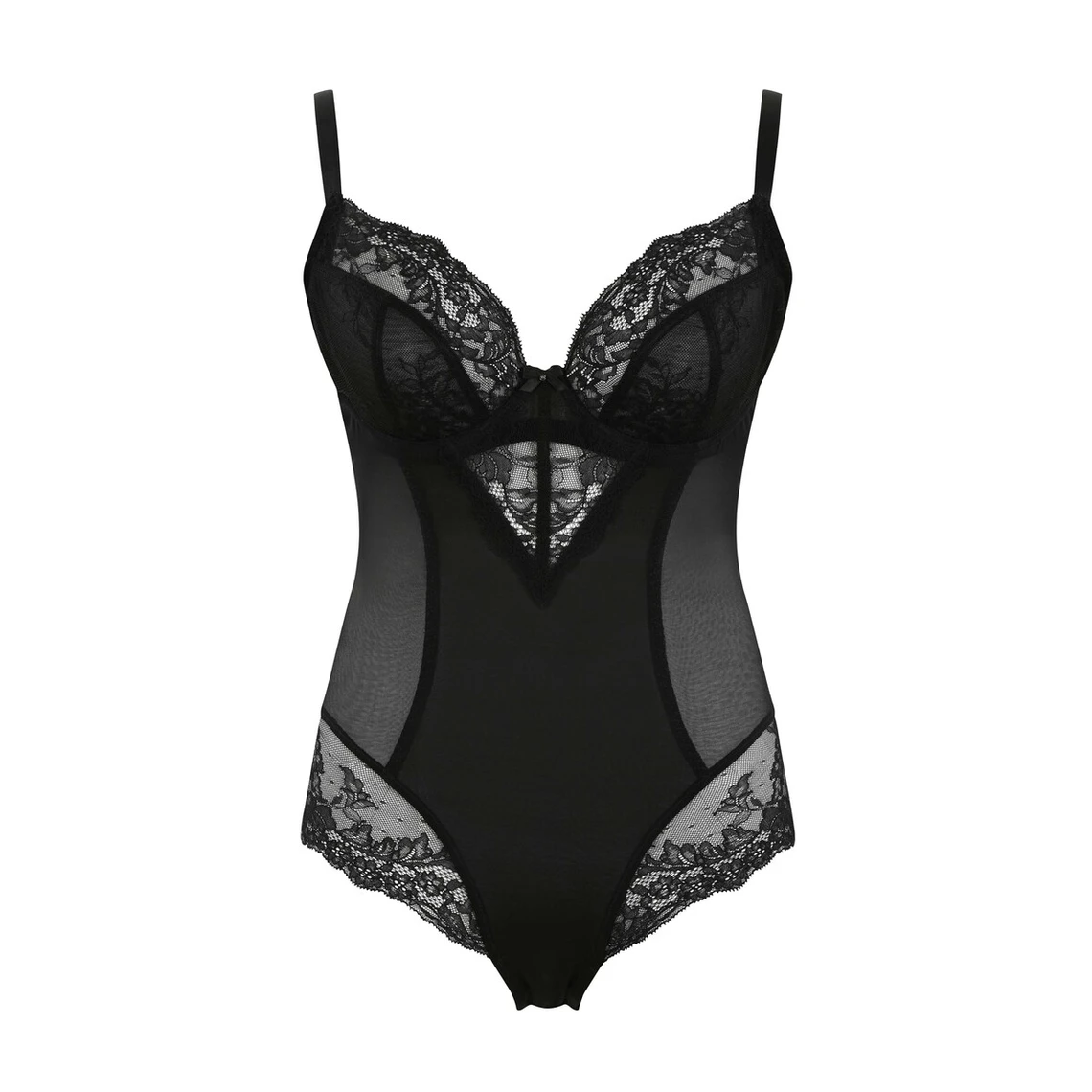 Ce bodysuit est réalisé dans un alliage de tulle et de dentelle et conquiert par son subtil jeu de transparence. Il propose un haut doté de bonnets armaturés, assurant à la poitrine une bonne tenue et un galbe rond. On retrouve un bas légèrement échancré, formant un fessier joliment rebondi.