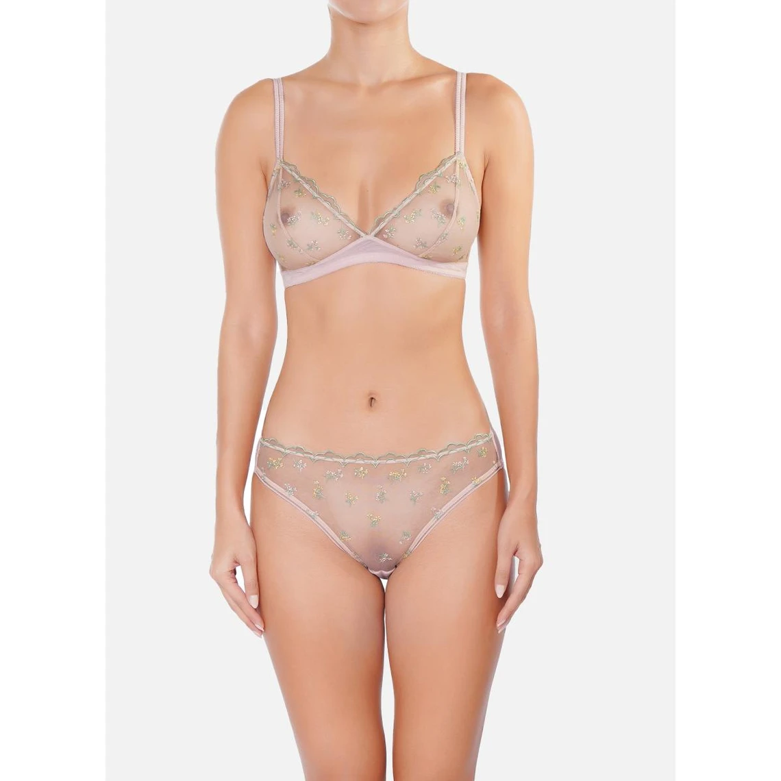 Dans des nuances douces de blush, ce soutien-gorge évoque une romance intemporelle, une teinte qui se fond avec la peau pour un effet enchanteur. Sur le décolleté, un trim d’un vert pomme éclatant apporte une note de fraîcheur, un détail raffiné qui souligne avec subtilité la féminité.