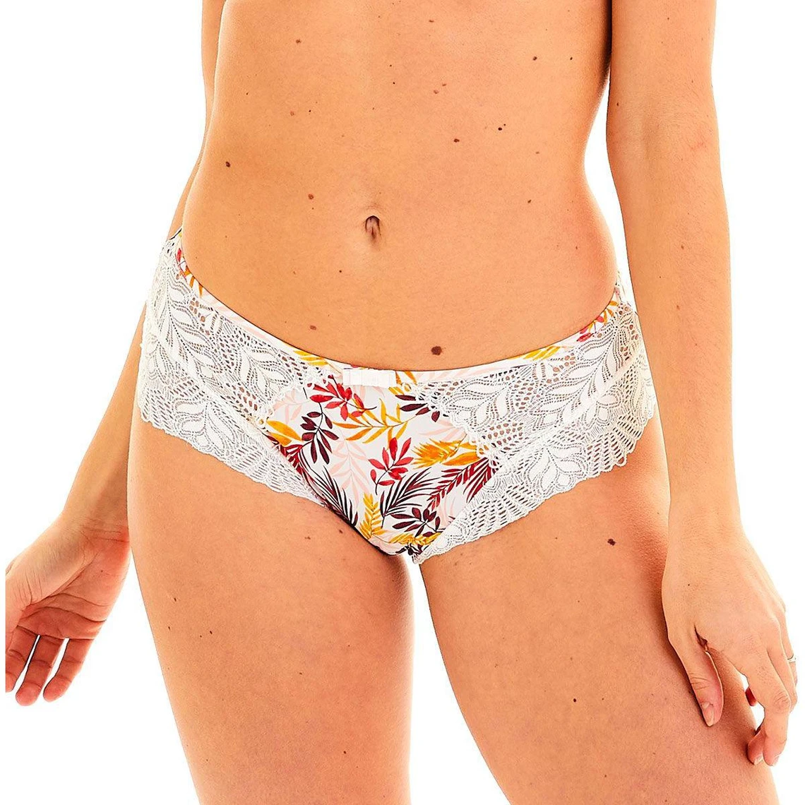 Il se caractérise par l’imprimé au motif feuillage multicolore de sa microfibre et le raffinement de sa dentelle d’inspiration végétale. Outre sa grande douceur au toucher, le modèle promet un confort de port imparable. Sa taille est marquée par une ceinture élastiquée, vous assurant un maintien exceptionnel. Afin de vous promettre un bien-être optimal, le fond est surplombé d’un gousset en coton.