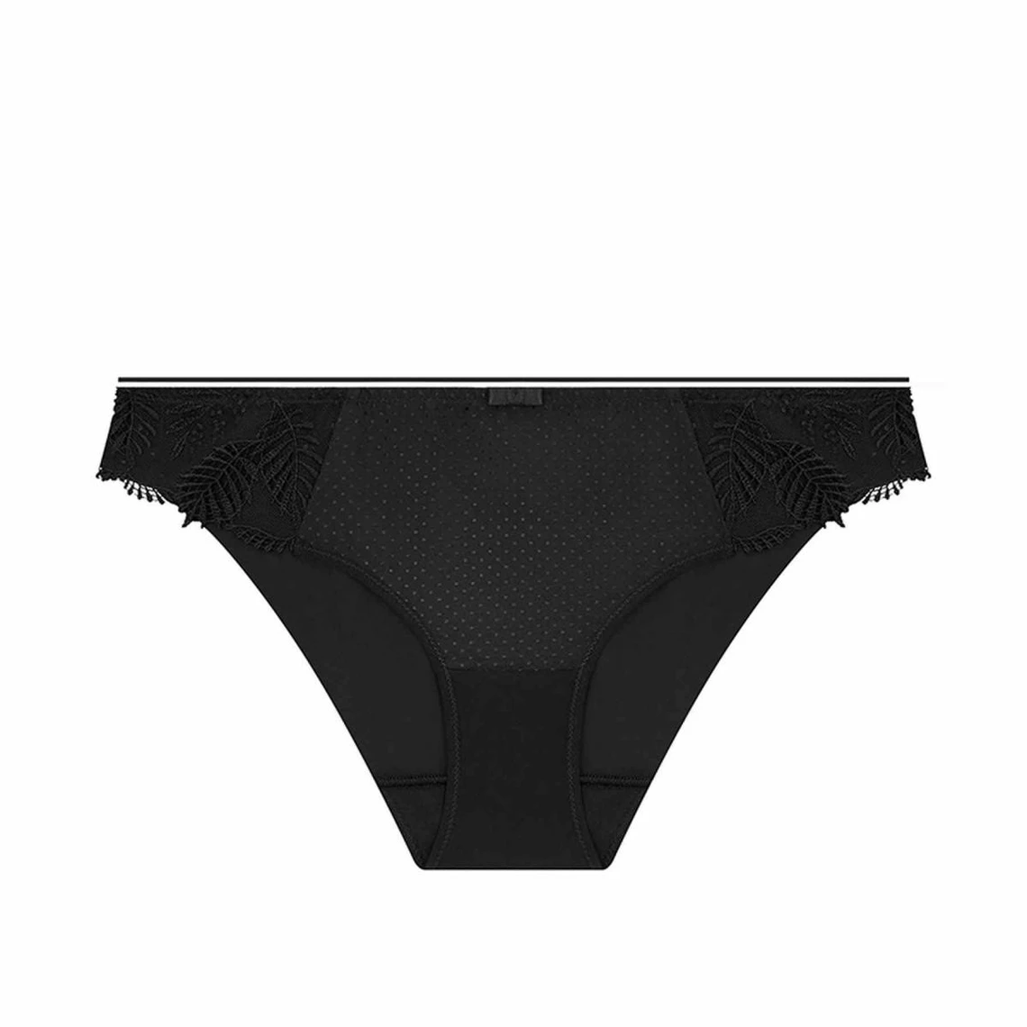 Sa coupe classique en fait un dessous pratique du quotidien. L’avant centrale se compose d’une maille crêpe plumetis délicate pour un confort absolu au porter. Les côtés sont habillés d’un empiècement de broderie en festons de guipure. Ce détail ajoute élégance et sophistication à toute la pièce.