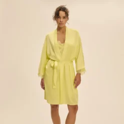 Ce sublime Kimono – Jaune d’été est signé par la prestigieuse marque Simone Pérèle. Il se démarque par son élégance et son style unique. Sa couleur vibrant jaune ajoute une touche d’été, tandis que sa simplicité se reflète à travers son motif uni. Il offre confort et liberté de mouvement, idéal pour les moments de détente ou les soirées cosy. Regardez l’image, et imaginez-vous enveloppé dans ce luxueux kimono, ajoutant une esthétique chic et sophistiquée à vos tenues de chambre.