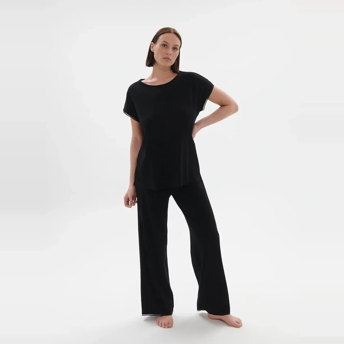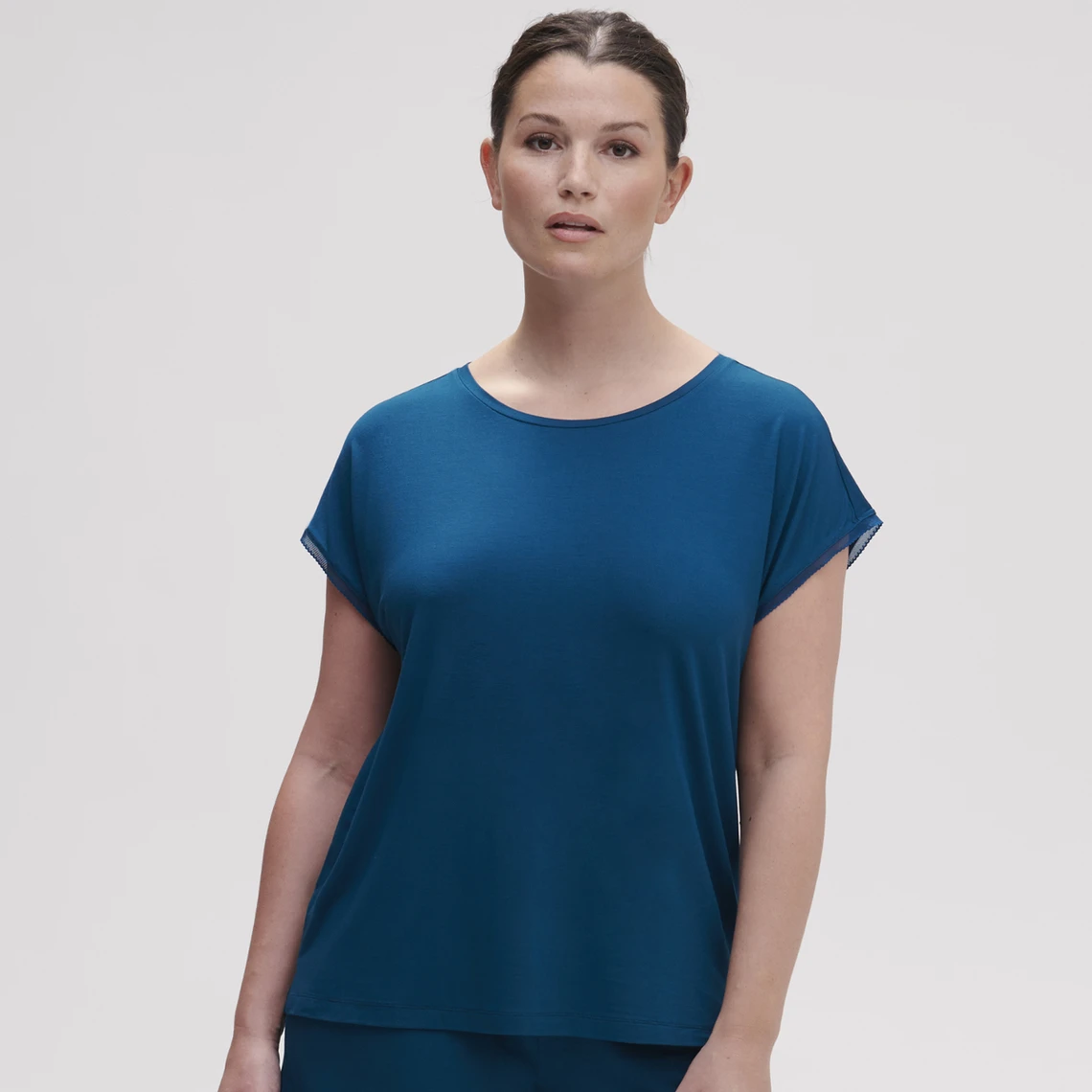 Une maille éco-responsable toute douce mixée à un détail dentelle féminin. Le nouveau basique, à porter du matin au soir.