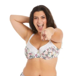Soutien-gorge armatures emboitant. Décolleté classique. Microfibre imprimée motif feuillage et galon de dentelle florale graphique. Petit noeud en satin à l’entre-bonnet. Bretelles larges réglables. Fermeture dos : 3 agrafes, 3 positions. Disponible du 90D au 110E.
