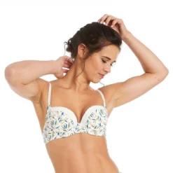 Soutien-gorge coques en microfibre imprimée motif floral et galon de dentelle graphique. Décolleté classique. Petit noeud en satin à l’entre-bonnets. Bretelles réglables. Fermeture dos : 2 agrafes, 3 positions. Disponible du 85B au 95C.