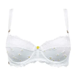 Cette création de la marque Brigitte Bardot est constituée de tulle brodé de motifs all-over marguerites qui fait son charme et son originalité. Des empiècements de dentelle fine d’antan naissent sur le décolleté, l’entre-sein et le basque pour une touche raffinée. Le nœud gros-grain satiné apporte couleur et fantaisie à toute la pièce. Ses bonnets à coques sont pourvus d’armatures pour apporter confort et maintien à la poitrine.