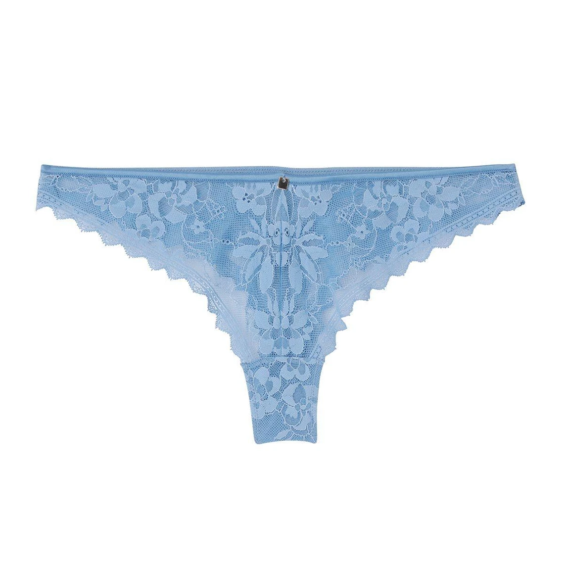 Tanga brésilien en dentelle dentelle française NOYON. Forme échancrée. Bouton fantaisie à la ceinture élastiquée. Fond doublé d’un gousset 100% coton. Disponible du 36 au 46/48.