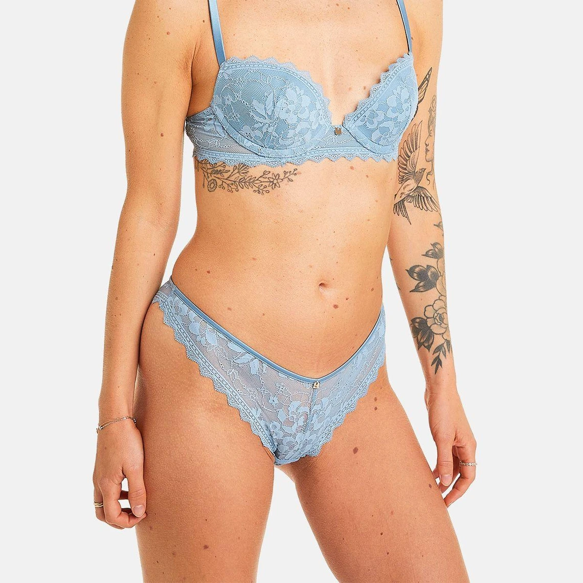 Dentelle : 85% Polyamide 15% Elasthanne. Matière secondaire : 95% Polyester 5% Elasthanne. Doublure fond de slip : 100% Coton.