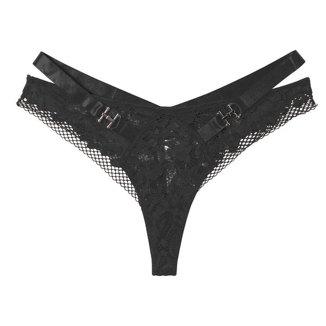Tanga tout en dentelle florale. Jeu de larges élastiques « bondage » et bijoux métalliques sur les hanches. Fond doublé d’un gousset 100% coton. Disponible du au 46/48.